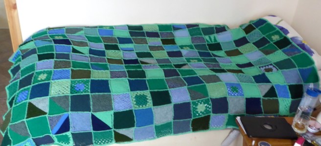 knitted square was done diagonally so that tension or yearn weight would not