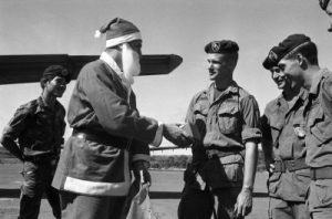 Santa Claus hands out presents to the men of Detachment 35, Company B, 5th Special Forces Group, in Vietnam at the end of 1968. The Air Force lent Santa six C7 Caribou cargo planes for his deliveries in Vietnam. The planes enabled him to visit some 50 isolated outposts – such as this Special Forces camp in Nahon…