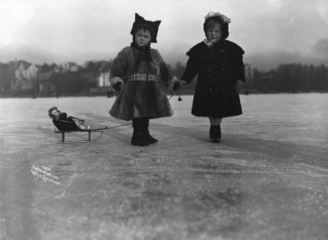 Two little girls – this is an old photo I found on the internet. I think it is from Northern Europe -the Netherlands? Are these little girls standing on ice? Pulling their dolly on a small sled? Rather sweet.