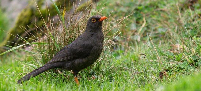 The Great Thrush can weigh as much as 175 grams; for comparison, a big American Robin might weigh 77 grams. Some subspecies run to 33 centimeters in length; the America Robin is about 25 centimeters. The dark gray body, orange bill and legs are pretty distinctive; in the males, the orange eye ring is definitive.