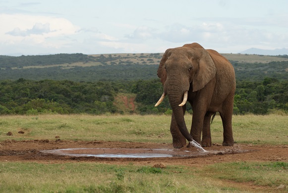 It is time to revisit elephants, I think, and where better to search for pictures than to go through my folders of the Addo Elephant National Park. Elephants are such photogenic creatures that I have endless images of them. In this post I will feature elephants drinking at various waterholes within the park. The first is of a lone elephant at the Peasland waterhole in 2015 – before it was decided to surround it with a rectangular seclusion barrier with electrified strands hanging down so that smaller species of animals would be able to drink without having to compete with elephants. This elephant swished the water around like this for a while before it actually began drinking.