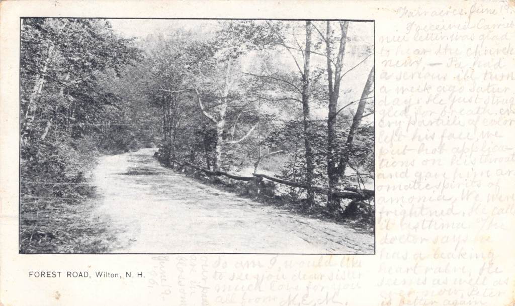 The caption printed on this postcard reads “Forest Road Wilton N.H.” but for me the image is a country road and I place it in an adjoining town – Milford New Hampshire – and the road leads to my sister’s old farm. Years ago.