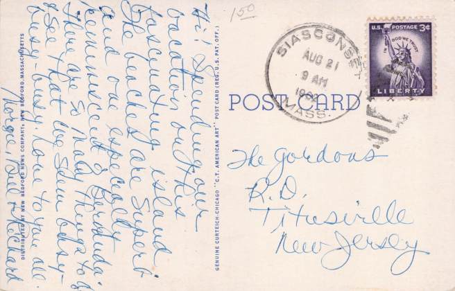 The format of the postcard reflects its dating – i.e. a white border surrounding the picture. The postmark is dated Aug 1962. The purple Liberty stamp also reflects an early 1960’s date.