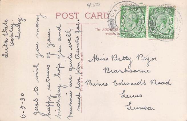 Reverse side – Note the neat handwriting, the date June 1930, the British stamps and postmarks, and the British (Sussex) destination. And the sender gave a Surry address also.