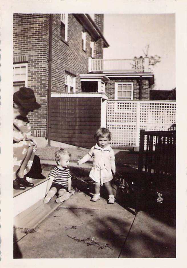 Janet (standing), my cousin Rusty (on the ground), our maiden Aunt (“Auntie”) supervising