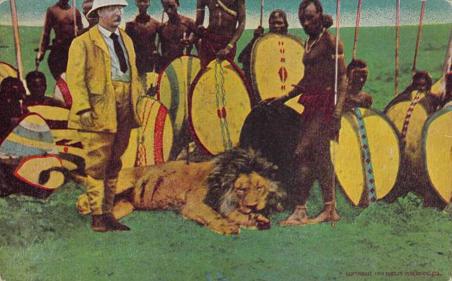 Lion Hunt on Athi Plains – Lions abound in great numbers in the Athi District, and carefully organized hunts are of frequent occurrence. The native beaters surround a portion of the plain and then drive the lions toward the hunter. Occasionally a native is forced to engage in a close-range fight with the “King f Beasts.” and is fortunate if he escapes with his life. In this instance however the lion was killed instantly, the spear having gone through his chest and out at the side.