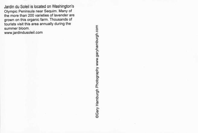 Reverse side – Jardin du Soleil is located on Washington’s Olympic Peninsula near Sequim. Many of the more than 200 varieties of lavender are grown on this organic farm. Thousands of tourists visit this area annually during the summer bloom.