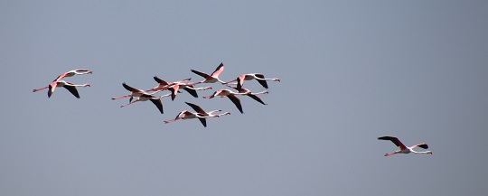 Some time ago I proudly showed you photographs of the flamingos we were able to observe in the West Coast National Park. This flock of Greater Flamingos is flying over a dam in Gauteng: