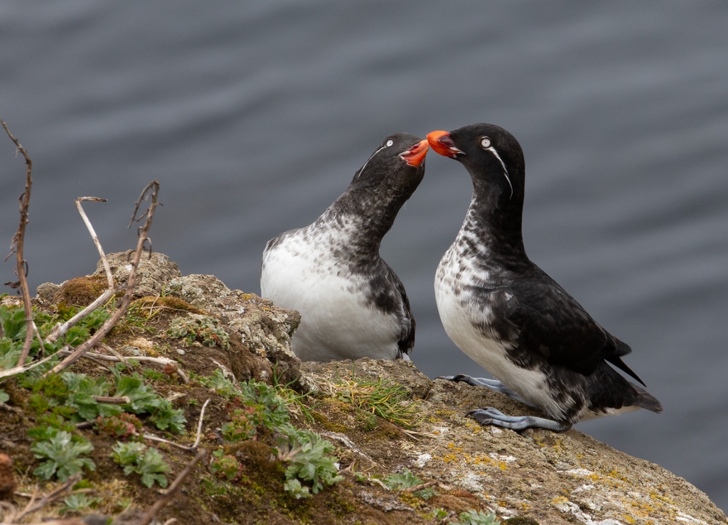 This is a beautiful seabird whose white irides (the area of the eye surrounding the iris) stand out dramatically from the black head, along with the striking, ornamental white facial plumes. The bright orange bill is nearly round. The breeding colonies are not large, and not densely populated, but you’d think otherwise from the sound, near-continuous whiney calls during courtship.