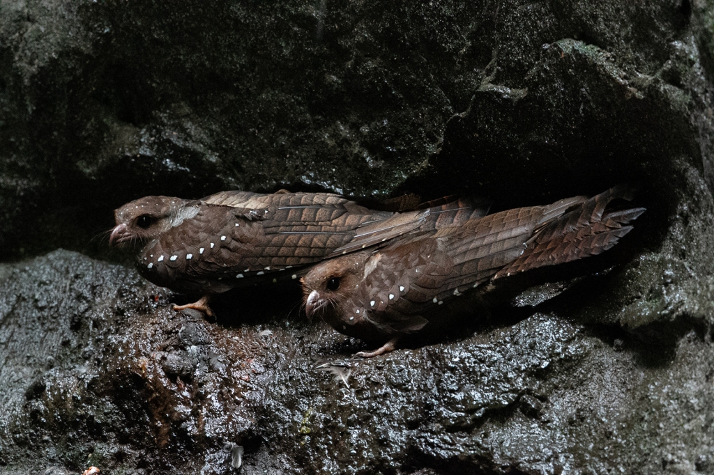 Oilbirds – the species’ hatchlings are heavier and fattier than a full-grown adult, and were rendered for oil on occasion; hence the common name – are distant cousins of Nightjars, the crepuscular/nocturnal insect eating birds like the Common Nighthawk. But the Oilbirds split off from the Nightjars a long time ago. A really long time ago, in the early Eocene. More than 50 million years ago. A fossil Oilbird was found in the Green River Formation in Wyoming. That also suggests that Oilbirds were widely dispersed in earlier days; today they are confined to the northern half of South America.